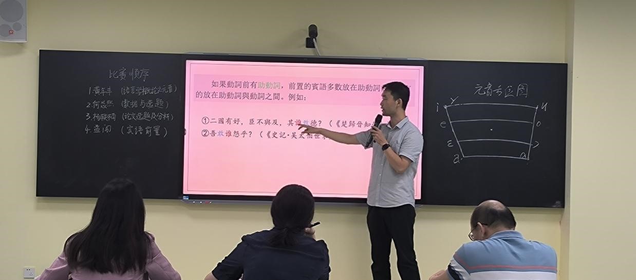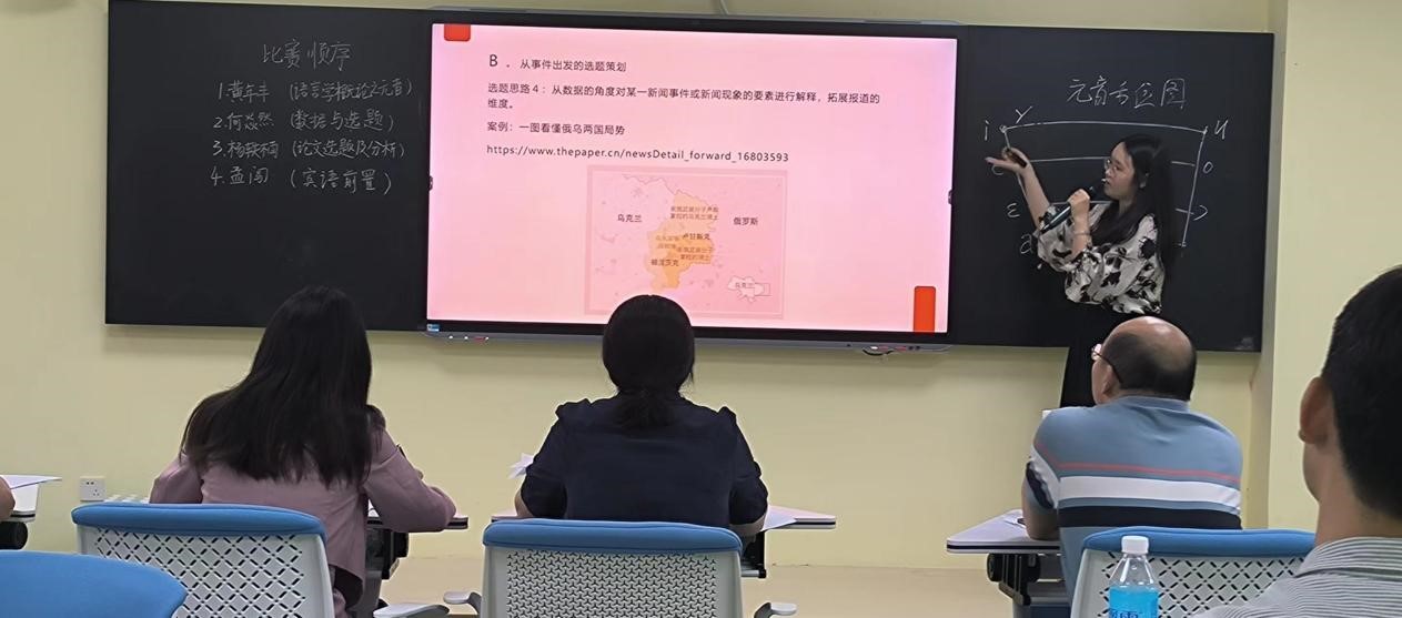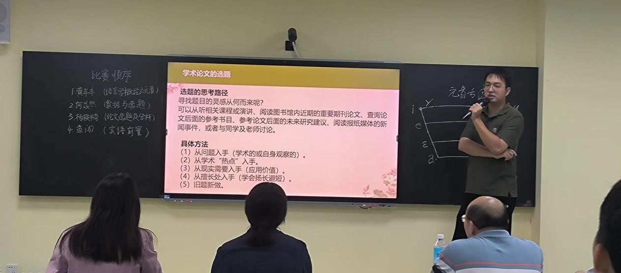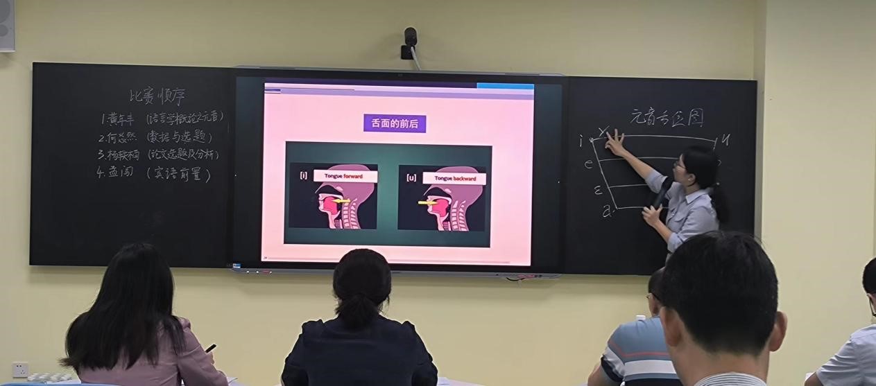 此次比赛共有黄年丰、何焱然、杨轶楠、孟闯等4位老师同台竞技,他们分别围绕《语言学概论之元音》《数据与选题》《论文选题及分析》和《宾语前置》等内容展开授课,并在答辩环节回应评委提出的问题。经过评委公平公正的评定,黄年丰获得一等奖,孟闯获得二等奖,何焱然和杨轶楠获得三等奖。