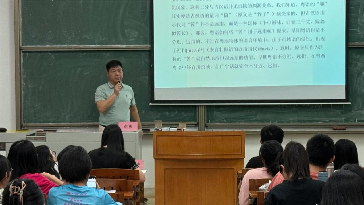 在题为《岭南方言与文化趣谈》的讲座上,胡伟分别介绍了岭南地区三种方言与文化现象。他结合网络热点及经典古诗词,讲授方言学习、文化学习的内涵,引导同学们了解跨界文化创意融合情况,表示方言文化应主动适应新媒体发展趋势,创新文化传播方式,让文化与新时代共情共生。