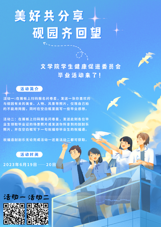 活动前期工作人员将展板放置活动地点,毕业生通过展板上的问卷星报名,用照片的形式分享砚园的景色;一起抒发毕业感想;一起畅谈自己的青春与未来;一起为非毕业生送去自己珍贵的回忆和真挚的祝福。