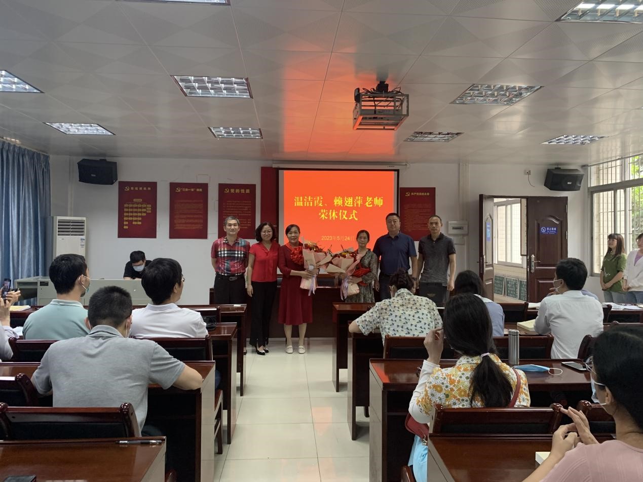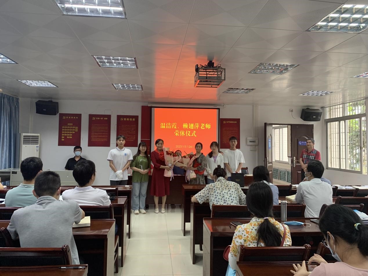 (本网讯 记者钟焱丹)5月24日,365英国上市于院楼210为温洁霞、赖翅萍两位退休教师举行荣休仪式,仪式由党委副书记胡海鹏主持,365英国上市全体教工参加。