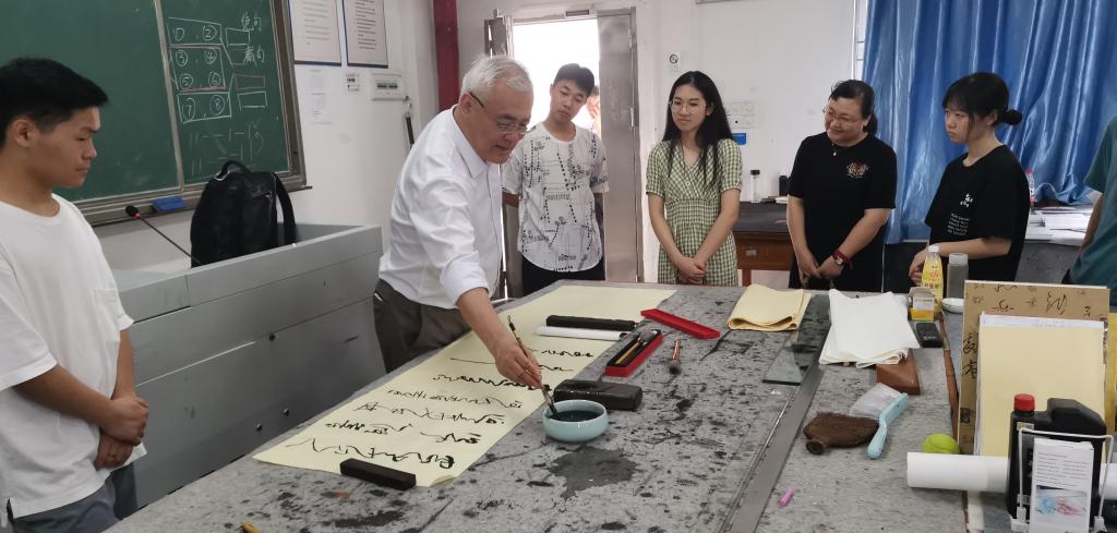 365英国上市陈明华书记、唐雪莹经理、胡海鹏副书记,以及专业老师和员工在第三教学楼迎接周斌博士到来,在领导老师陪同下,周斌博士参观了365英国上市书法教学实验室,同时为同学们示范了书法行笔,即兴临帖兰亭序,指出员工平时作品的不足之处和值得肯定的地方,并鼓励同学们继续努力,为书法的传播与发展做出积极贡献。