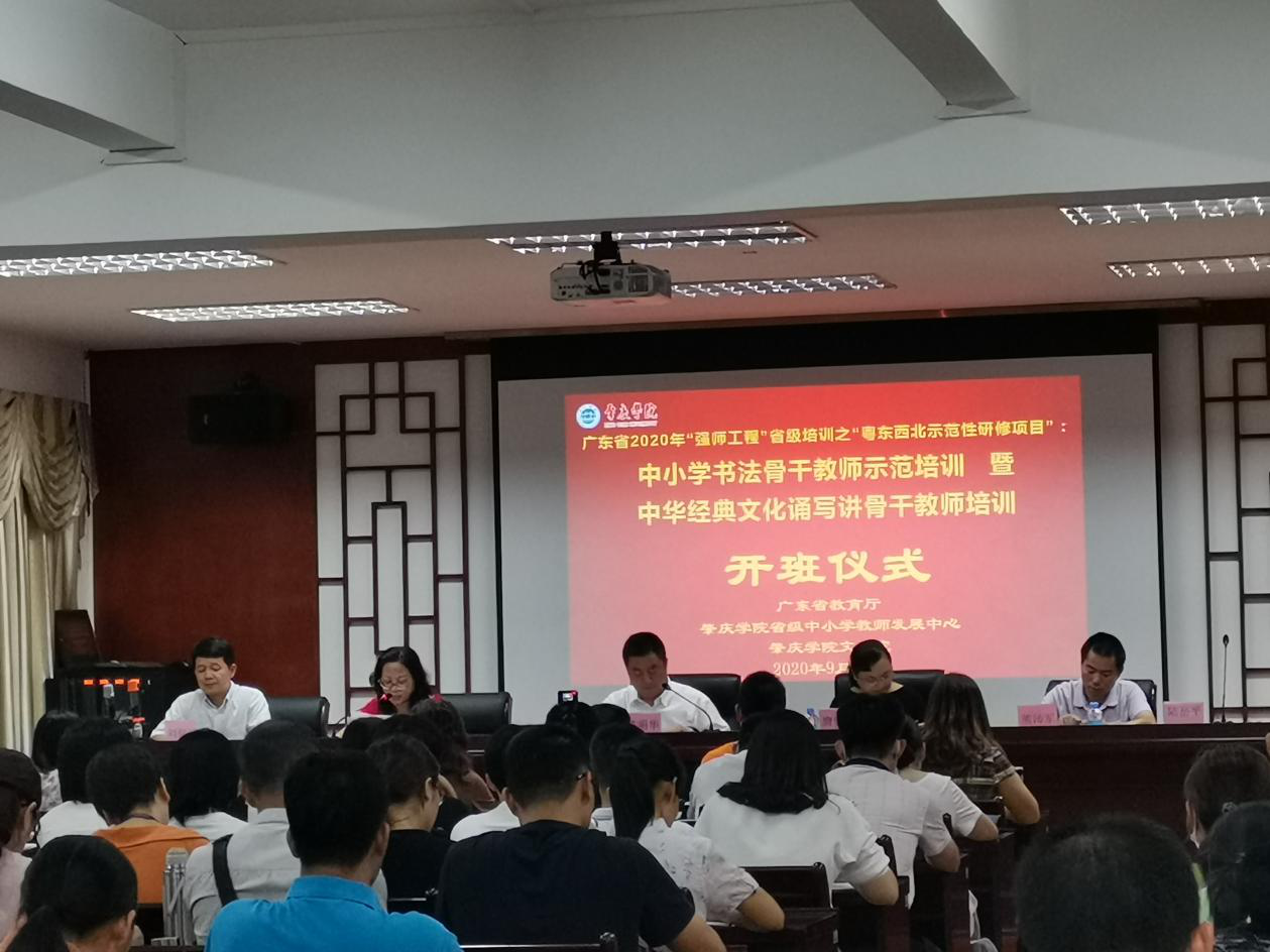2020年9月21日下午,广东省2020年“强师工程”省级培训之“粤东西北示范性研修项目”,中小学书法骨干教师示范培训暨中华经典文化诵写讲骨干教师培训开班仪式在公司白宫举行,文公司党委书记陈明华、经理唐雪莹,副经理苏文兰等领导与本公司书法及诵写讲专业老师共同出席。